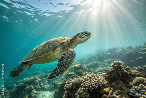 © Arethaawykoff, Obraz premium graceful sea turtle glides through clear waters, surrounded by vibrant coral reefs