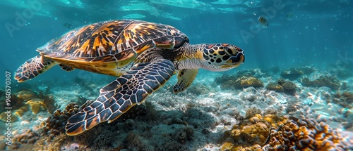Fototapeta premium Graceful Sea Turtle Gliding Amidst Colorful Seabed Wonders