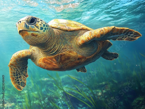 Fototapeta premium Graceful sea turtle gliding through clear blue water with vibrant underwater vegetation and sunlight filtering through the ocean surface