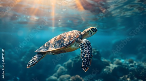 Fototapeta premium Graceful Sea Turtle Swimming Peacefully in the Vibrant Ocean Depths