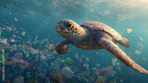 Obraz premium Graceful Sea Turtle Swimming Through Ocean Surrounded by Plastic Waste and...