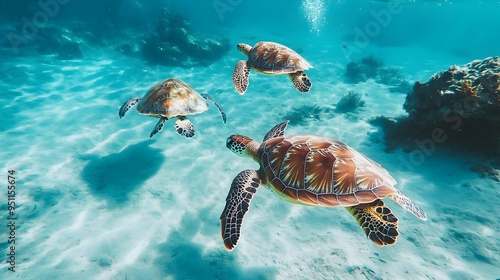 © Ratchadaporn, Obraz premium Graceful Sea Turtles Gliding Through the Tranquil Ocean Depths