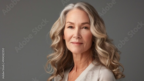 Fototapeta premium Graceful senior woman with long wavy gray hair. Elegant elderly lady with a serene smile. Studio portrait on a neutral gray background.