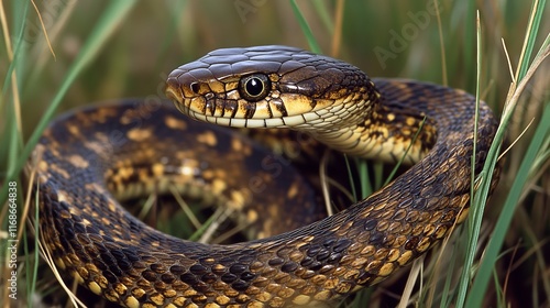© Thavesak, Fototapeta premium Graceful Serpent in Sunlit Meadow - Intricate Scales of a Small Snake Gleaming Among Tall Grass