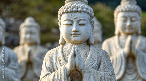 © Generative AI, Obraz premium Graceful Stone Buddha Statues in Contemplative Outdoor Space : Generative AI