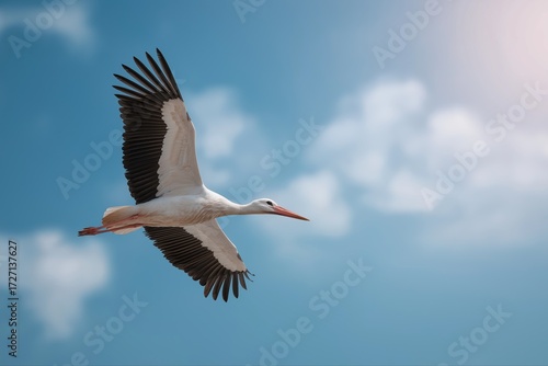 Fototapeta premium Graceful stork soaring in the sky under sunlight