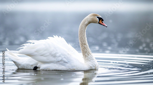 © Lull, Fototapeta premium Graceful swan on water. Elegant white swan swimming on a calm lake with a soft focus on its feathers..