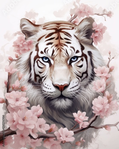 © Mary, Fototapeta premium Graceful Tiger and Cherry Blossoms in a Soft Pastel Palette