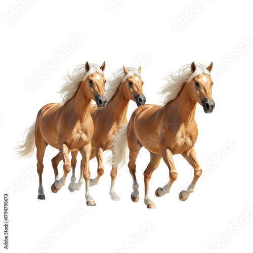 Obraz premium Graceful trio of palomino horses in full gallop, presented on a neutral,...