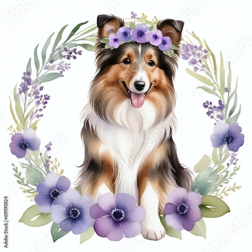 © Hikari , Fototapeta premium Graceful Watercolor Portrait of Shetland Sheepdog, Wearing a Purple Flower Crown, Surrounded by a Purple Flower Garland