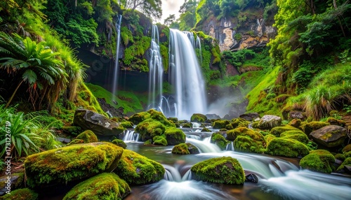 © Rizka, Naklejka premium Graceful Waterfall Surrounded by Dense Green Forest and Moss-Covered Stones