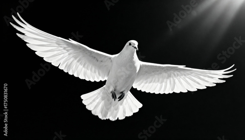 Fototapeta premium Graceful white dove soaring against dramatic black background with wings fully spread and illuminated by soft sunlight