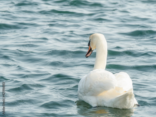Naklejka premium Graceful white swan (Cygnus olor) swimming on a lake or sea