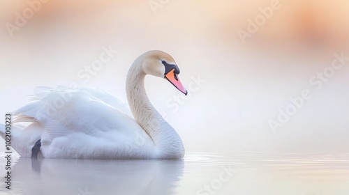 Fototapeta premium Graceful white swan gliding across a still lake, showcasing its feathers...