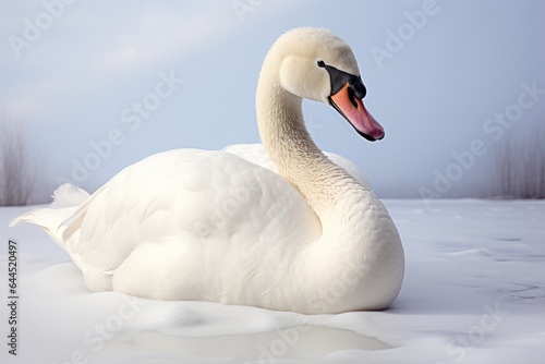 Obraz premium Graceful white swan on snow, winter background