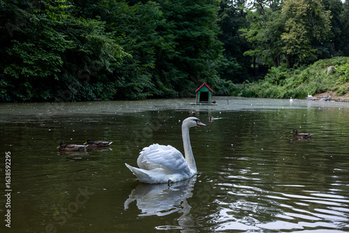 © Владислав Легір, Obraz premium Graceful white swan spreading wings while standing in water on a peaceful lake with ducks in summer park