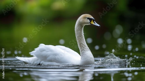 © huhu, Obraz premium Graceful white swan swimming in calm water, creating ripples.