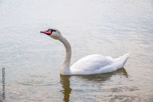 Fototapeta premium Graceful white Swan swimming in the lake, swans in the wild. Portrait of a...