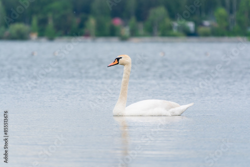 Fototapeta premium Graceful white Swan swimming in the lake, swans in the wild. Portrait of a white swan swimming on a lake.
