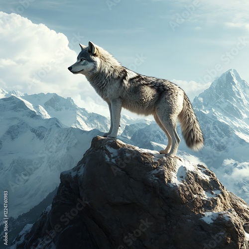Obraz premium Graceful wolf standing snowy mountain surrounded majestic peaks glowing...