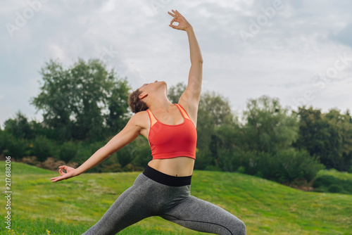 © zinkevych, Fototapeta premium Graceful woman. Slim graceful woman feeling simply amazing and relaxed while doing yoga poses outdoors