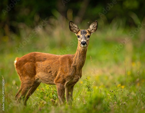 Fototapeta premium Graceful young deer standing alert in a lush, green meadow, framed by blurred...