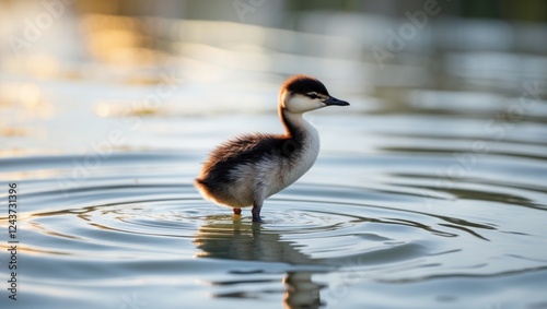 © AkuAku, Fototapeta premium Graceful young grebe chick standing on serene water surface with gentle ripples and soft reflections showcasing peaceful aquatic life.