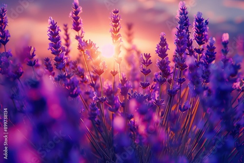 Naklejka premium Gracefully moving organic lavender flowers in the twilight breeze at dusk. Fields of european lavender. Blooming fragrant purple lavender plants as the sun sets