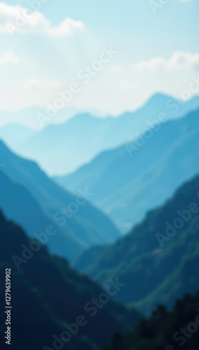 Fototapeta premium Gradated blues with blurry foggy landscape featuring misty mountains and...