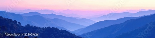 © dadtophoto, Fototapeta premium Gradient swirls blend with misty hills, blue and purple hues softening the terrain, natural landscape, soothing colors