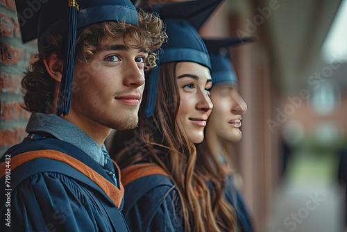 Obraz premium Graduates standing back-to-back, caps on their heads, looking towards a...