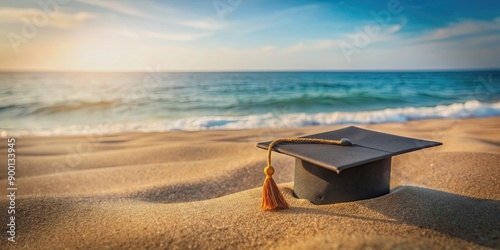 Naklejka premium Graduation cap on sand at beach with ocean background, graduation, cap, beach, sand, ocean, background