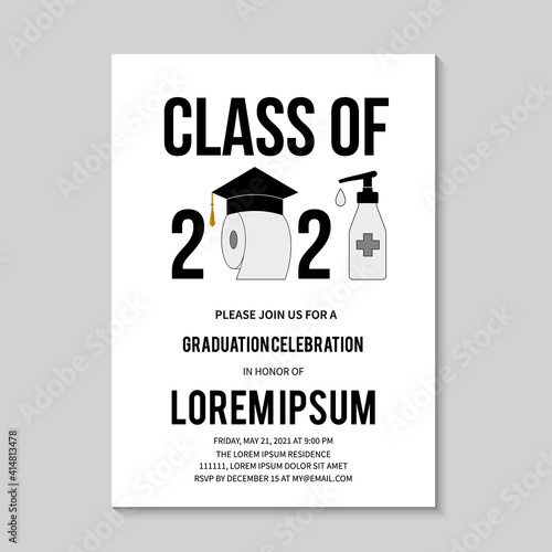 Naklejka premium Graduation Ceremony Class of 2021 invitation card with toilet paper. Funny graduation party invite. Coronavirus COVID-19 Quarantine concept. Grad announcement template. Vector illustration