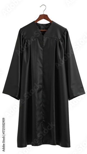 Fototapeta premium Graduation gown hanging on wooden hanger, showcasing sleek black design,...