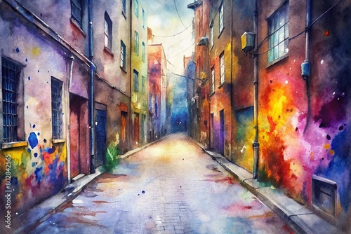 Fototapeta premium Graffiti Alley: Urban-inspired graffiti splatters in a kaleidoscope of colors against a gritty alleyway backdrop, capturing the vibrant energy of street art.
