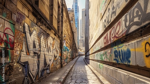 Fototapeta premium Graffiti Alley with Urban Skyline Background