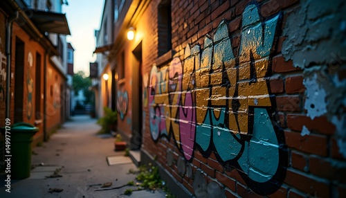 Fototapeta premium Graffiti Art on Brick Wall in Urban Alleyway at Dusk