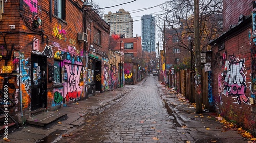 Fototapeta premium Graffiti-covered brick alleyway on a cloudy autumn day.