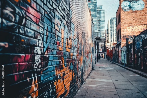 Fototapeta premium Graffiti-covered brick wall in an urban alleyway, capturing street art and vibrant culture, perfect for edgy and contemporary themes, showcasing artistic expression and city life