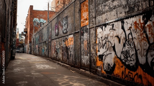 Fototapeta premium Graffiti Covered Fence in Grungy Alleyway with Urban Texture