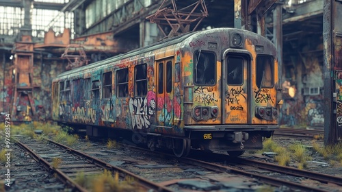 Fototapeta premium Graffiti-covered train car in a railyard surrounded by industrial equipment,...