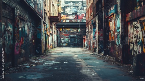 Fototapeta premium Graffiti-Covered Urban Alley: A Moody, Atmospheric Street Scene