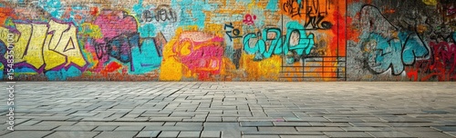 © Dewi, Fototapeta premium Graffiti-covered wall and paved floor