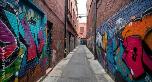 Fototapeta premium Graffiti covered walls along a narrow alley background colorful street art decorating brick surfaces adding character to an overlooked passage