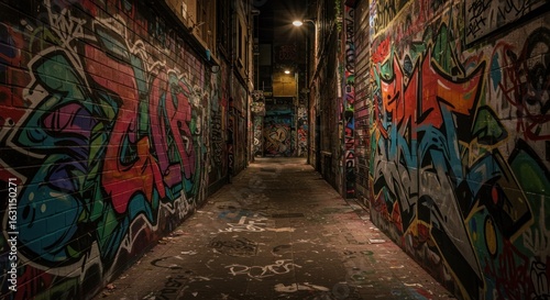 Obraz premium Graffiti-Lined Alleyway at Night: Urban Art and Dim Lighting