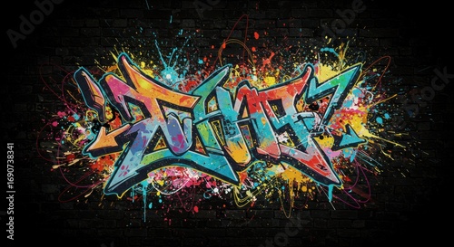 © Zakky, Naklejka premium Graffiti mural with vibrant colors on a dark brick wall