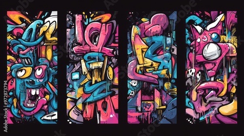 Naklejka premium Graffiti t shirt designs set, Streetwear graphic for clothing design. Graffiti poster illustration, Urban t-shirt design for print