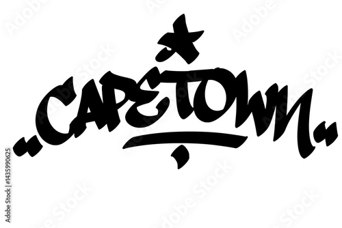 © dirtyfellas, Fototapeta premium Graffiti tag text "Cape Town" in bold street art style. Hand-drawn vector lettering with vibrant, coastal energy. Isolated on a white background, perfect for designs, fashion, and merchandise.