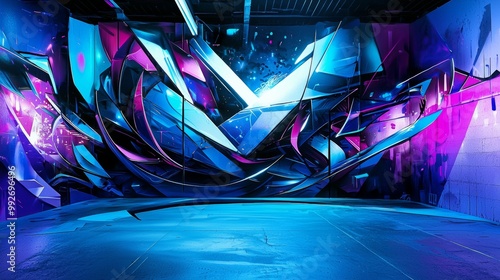 © J, Naklejka premium Graffiti wall with futuristic cityscapes, sleek urban architecture blending into abstract street art