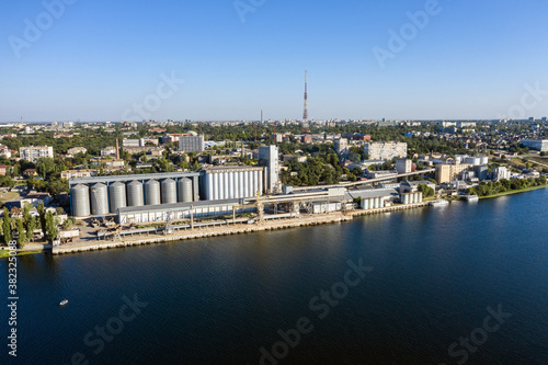 © ronedya, Obraz premium Grain elevator and silos near the river aerial view.